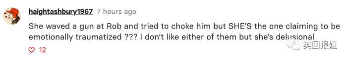 网友3:“她对着小罗伯特举枪,还掐他脖子,然后说自己是受到情感伤害的人?两边的人我都不喜欢,但她的确有妄想症。”