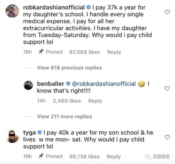 小罗伯特发完没多久,查娜儿子的爸爸Tyga也回应:“儿子一年学费4万美元,我付;儿子周一到周六都跟着我,我干嘛给你抚养费?”