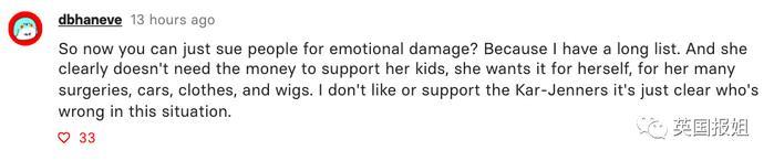 网友1:“她明显不需要这些钱来照顾孩子,而是为了自己,她的手术、车、衣服和假发。我不喜欢也不支持卡詹家,但这种情况下谁对谁错很明显。”