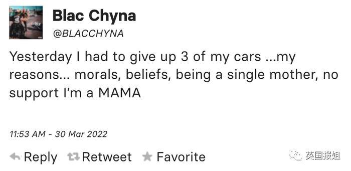 但是,到了今年三月底,查娜在社交媒体上说:“我卖了三辆车,原因是我作为单亲妈妈,没人帮我,我是个妈妈。”言下之意,自己带娃经济有困难。