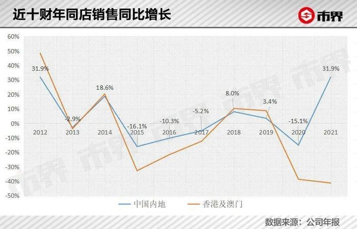 目前,周大福是我国零售网点最多的珠宝品牌,截至2021年9月,公司拥有5214个零售网点。2009财年到2021财年,周大福营收从184.1亿港元,增长至701.6亿港元,复合增长率达11.8%。其中,内地市场对其营收的贡献从54%,增长到了85%。赶上内地珠宝行业“黄金十年”快速开店的周大福,也迎来业绩的快速增长。