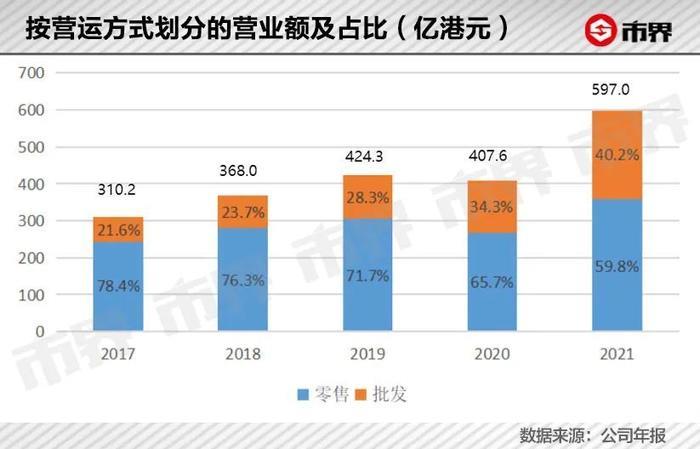 向加盟商销售商品和提供服务的收入,周大福算作批发业务;直营店销售商品为零售业务。2018财年到2021财年,周大福批发业务营收从67亿港元增长至240亿元,占公司总营收的比重从21.6%增长至40.2%。加盟商为周大福贡献的营收也就越来越多。