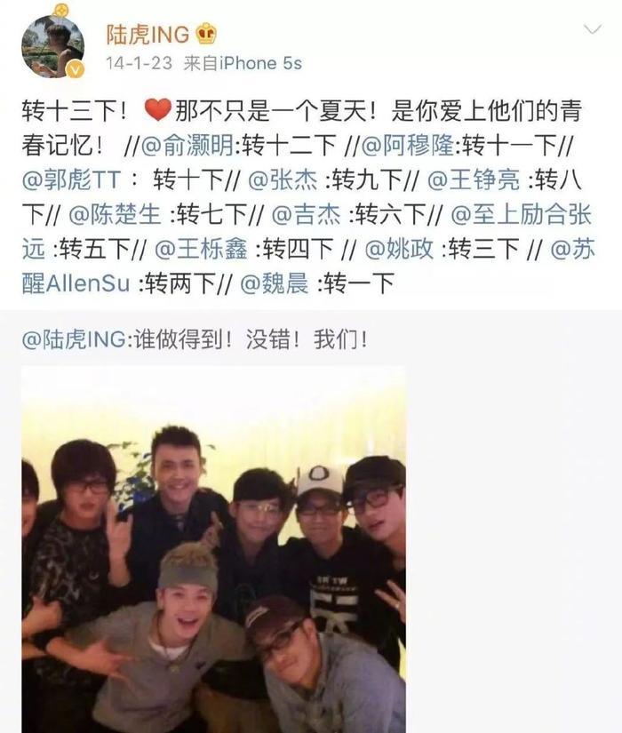 2012年聚会的时候,他们在微博接龙玩起了“谁最后一个到谁买单”的游戏。2014年他们再聚会,快男13强都转发了陆虎的晒合照微博,到了7月13日纪念日,他们也会发布微博纪念。