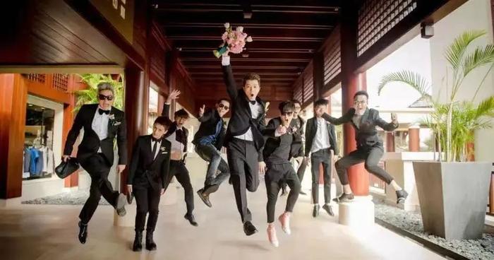 年纪最小、最早结婚的王栎鑫,他的伴郎也是快男的几个兄弟;
