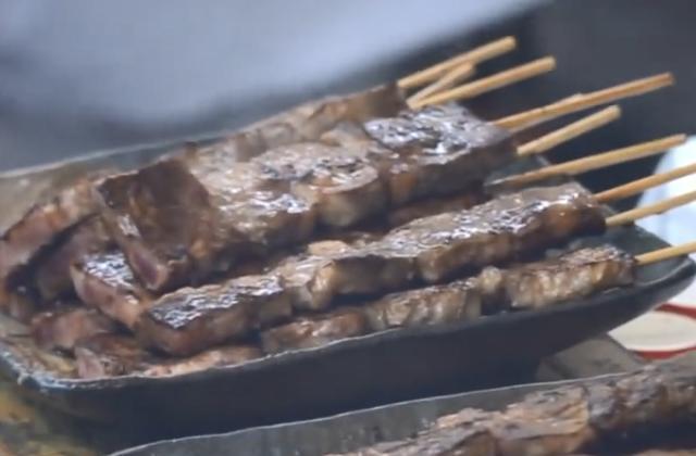 第三种就是糯米团,不过除了白糯米之外还有青团,颜色偏向绿色的感觉,看起来有点像“仙人掌”有没有?把一粒粒的糯米串联起来,然后拿到烤炉上烤,烤完之后外皮脆内则是柔软,吃起来又香又甜,口感非常的不错。