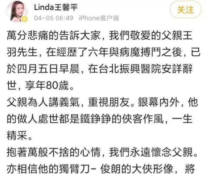 2022年4月5日,清明节这一天,在谢贤向曾江进行道歉后不久,曾被传言喊话谢贤爬去见他的王羽,走完了自己辉煌的一生,离开了这个美好的世界,享年80岁。
