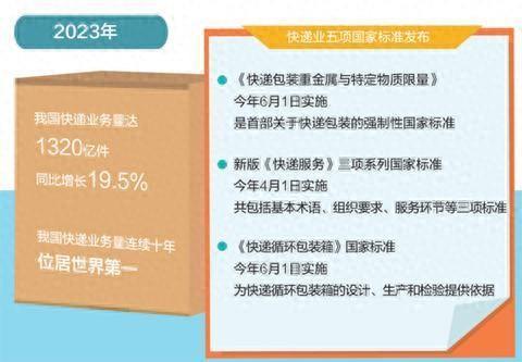 近年来,我国快递业持续快速发展,快递业务量连续十年位居世界第一。为进一步规范邮政行业发展,提升快递服务质量水平,推动快递业绿色低碳发展,国家标准委发布了五项国家标准,为打造更绿色、更安全、更便利的快递业提供技术支撑。