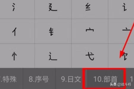 2、选择符号中的10部首,如图,就可以选部首了