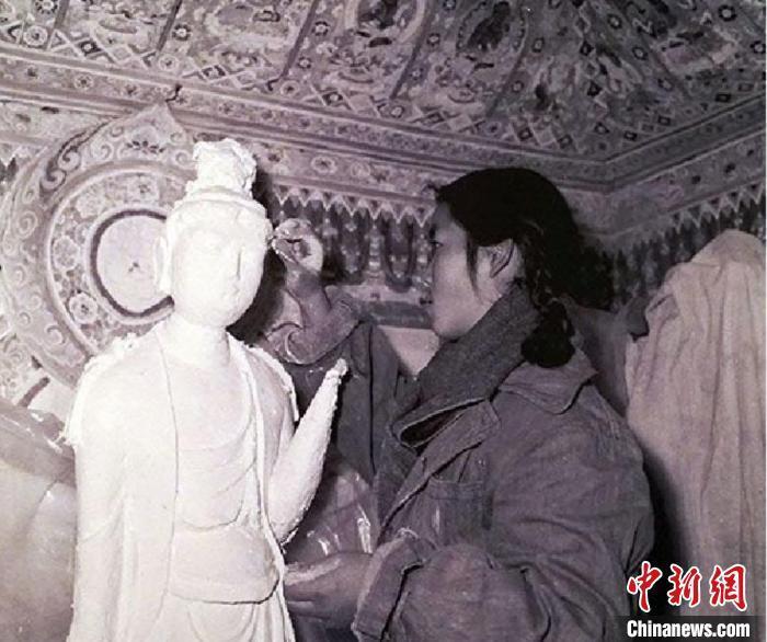 何鄂在敦煌文物研究所临摹敦煌彩塑。(资料图)何鄂雕塑院供图
