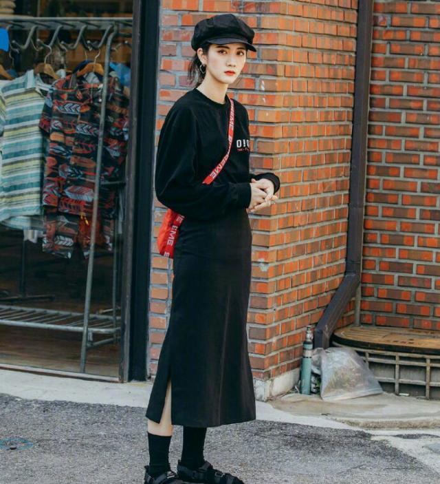想要穿出韩范又不失自己的个性,这就需要自己的肆意搭配了,但是又不能胡乱搭配。今天看这一身。黑色的V领打底衫,修饰了小姐姐的脸部轮廓,还有今年流行的微喇牛仔裤,是很多小姐姐都会选择的搭配。但是外边搭一件小的白色衬衫,是一处点睛之笔,干净利落,又不缺失自己的个性,展现了与众不同的风格。喜欢自己搭配的小姐姐就get吧。黑色的颜色一直是男女都比较钟爱的颜色,但是黑色的衣服比较挑剔人的肤色,太黑的妹子就不要选择一身黑了。这件圆领卫衣+黑色的开叉半身裙,白皮肤的人穿上是真的很好看。黑色的长筒袜和凉鞋,是比较新潮的穿搭。全身上下唯一的突出的颜色就是红色,帆布的红色单肩包,使一身的穿搭不单调,look起来好看极了~