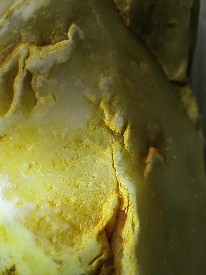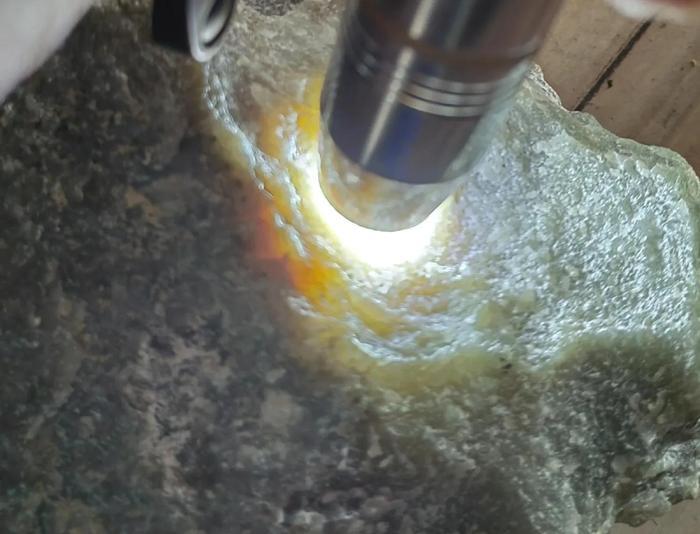 这一张图片是和田玉原石。它呈现的光圈范围不大,大约在3cm。看到的反射光线非常柔和。给人一种细糯油脂的感觉...