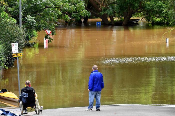 3月9日,居民在澳大利亚悉尼郊区温莎查看洪水的情况。新华社/法新