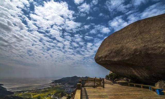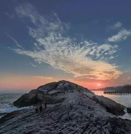 在大门岛上,从许多地方都可看到大门景区代表性的景观——龟岩,即神龟朝霞。龟岩峰海拔335米,峰顶的龟岩由两块巨石天然合成,身蹲西北,头朝东南,很像一只慢吞吞向前爬行的神龟,当它爬到峰巅时,正是旭日东升朝霞满天,便组成“神龟朝霞”这一瑰丽景观。这么大的神龟,怎么来的呢?据说东海龙王送了个神龟蛋给王母娘娘。王母娘娘爱不释手,经常赏玩,一不小心龟蛋滑落到凡间。龟蛋落到山岩,壳破了,爬出了一只神龟。王母娘娘随手端起一盆仙水倒了下来,神龟被水一冲,僵化成岩石,趴在山峰上不动了。龟背经水冲了之后陷成一个小潭。不论天多旱,潭里的水从不干涸,被视作“仙水”,掬一把潭水,不但能明目提神,还可消灾祛邪。龟岩峰是洞头列岛最高的山峰,峰顶的龟又特别显目,成了来往船只的航标,人称“东海圣迹”。龟岩东北侧约1公里,建有烽火台,遗址尚存。早在南宋建炎年间(公元1127—1130年)此地建有兵寨,设立烽火台与温州沿海各地保持军事联络。登上烽火台遗址,凭吊古迹,遥想千年前的战事,自有一番心绪。