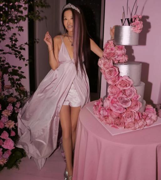 婚纱女王王薇薇73岁生日,一脸冻龄身材完美,蚂蚁腰抢镜