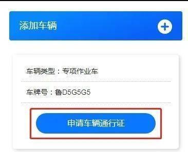 选择对应车辆下方《申请车辆通行证》按钮,继续下一步操作。如计划申请通行证车辆未添加,可点击上方添加车辆后边《+》按钮添加车辆后继续操作。