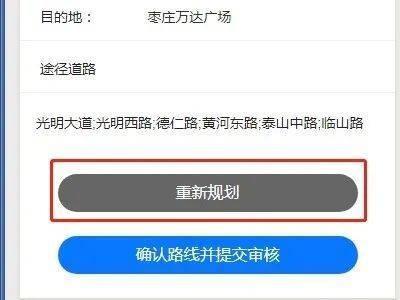 您需认真查看最上方地图显示路径规划是否为计划行驶道路(地图可拖拽)。如计划行使路线有差别,可点击最下方《重新规划》按钮,通过增加途经点的方式,微调行使路线。如下图: