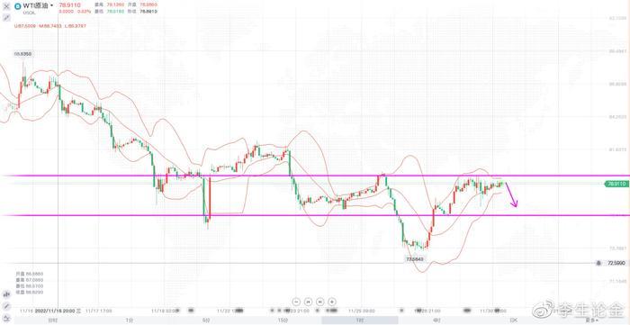 原油价格本周连续两天小幅反弹,不过价格的反弹力度并不大,日线级别,布林带有收口迹象,价格在下轨附近暂时企稳反弹,但上方79.5-80美元一线阻力强劲,价格多次试探未能上破,整个油价走势方向并未得到扭转。4小时,布林带走平,连续的反弹使得价格重回中轨上方,形成横盘震荡,之前也说过,在价格站上80美元之前,多头还需慎重。日内操作思路上尽量以反弹高空为主。