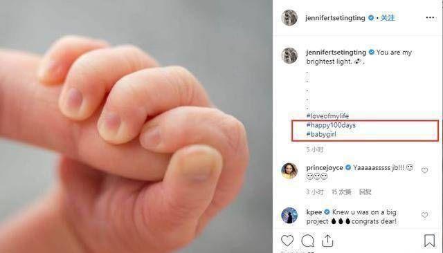 今天下午谢霆锋的妹妹谢婷婷在ins上晒出了一张宝宝手指的照片,并配文“Youaremybrightestlight”,同时随文还表示这是个女宝宝,然后已经一百天了。