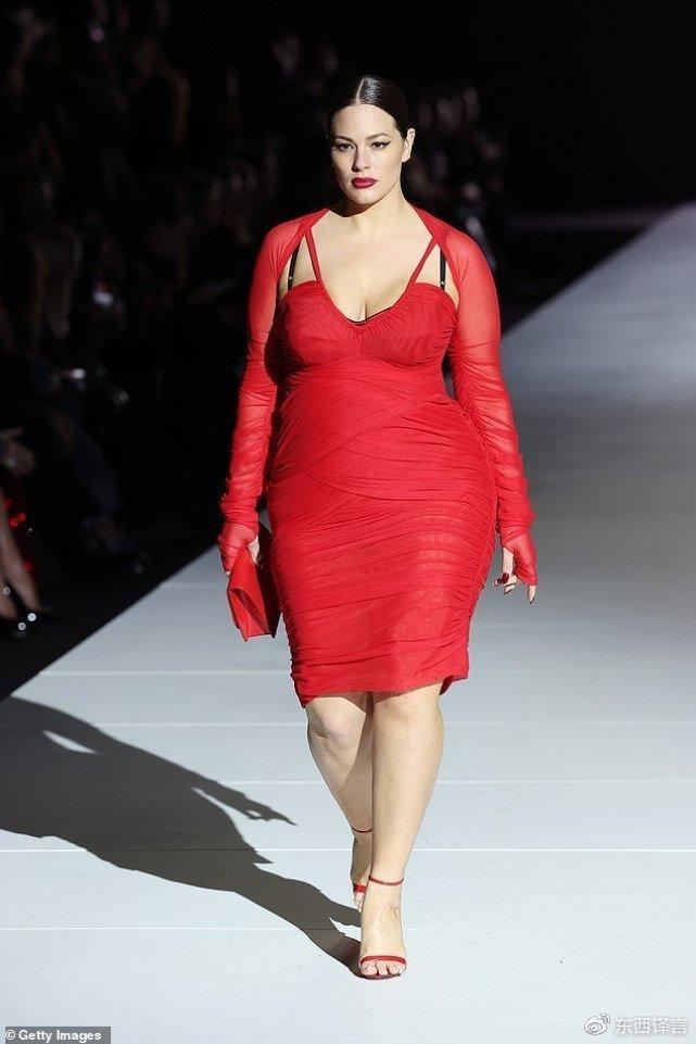 行走在米兰时装周的秀场上,穿着猩红色修身裙的阿什利,展现出了无人能及的气场。虽说很多人的审美标准都是“瘦”,但看到这样一位腰围远超2尺8的女士,也很难不发出赞叹之声,那种独特而强大的魅力,也让她成为了全球时尚圈中为数不多的一位大码超模。