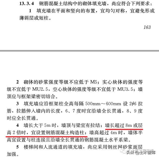 2、当按照国标执行时,遇到较长的填充墙时,应按照间距不大于4米设置构造柱;明眼的小伙伴应该发现三本规范中关于墙长超过5m和8m是矛盾的,其实逻辑上讲并不矛盾,墙长8m且间距不大于4m其实就是要求墙长超过5m必须要加构造柱了,但是墙长8m且间距不大于4m的适用性更广,因为对于超过8m的填充墙,GB50003的构造柱要求就不够明确了。