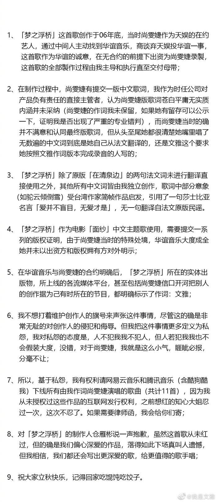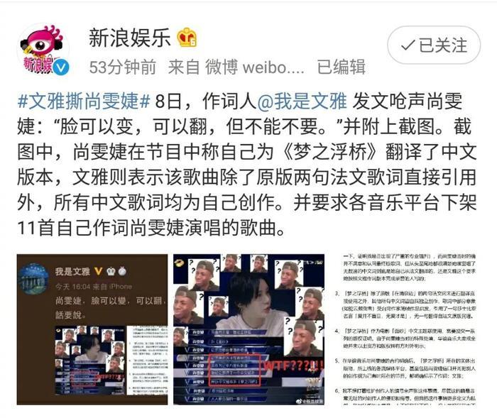 文雅开撕尚雯婕?尚雯婕为《梦之浮桥》翻译了中文版本,因为此事文雅开撕尚雯婕,还是坐等两位当事人的解释吧。