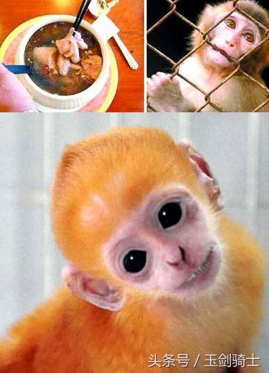 猴头:这里说的猴头绝不是食用菌猴头,而是真正的猴脑。食用猴脑多以生食,吃猴脑的餐桌中间开一洞,其大小恰好可穿进猴头。待猴头伸出桌面时,将活猴的头骨击出洞,再淋上热油,用银勺挖出脑 髓,即可食用。此时猴子尚未死去,哀嚎之声,撕心裂肺。真可谓残忍之至。