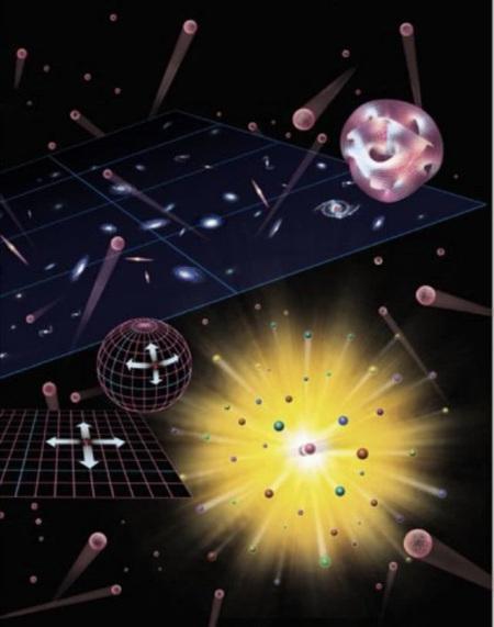 所以实际上在弦理论里空间是九维的。而我们人类,包括我们的可见宇宙,都因存在三维空间里,这也是M理论的指出的,因为构成我们物理世界的三种相互作用:电磁相互作用、强相互作用和弱相互作用均只能在三维空间内传播,仅有引力相互作用可以穿透三维空间传播到九维空间。