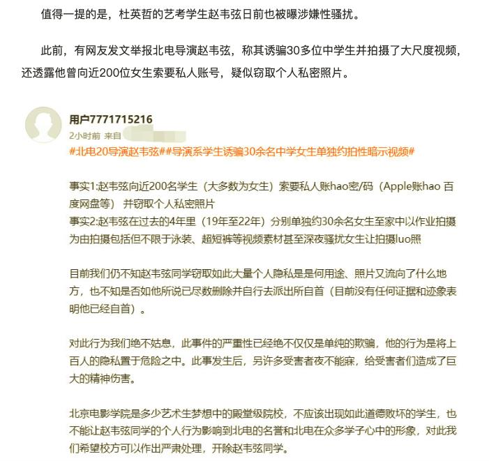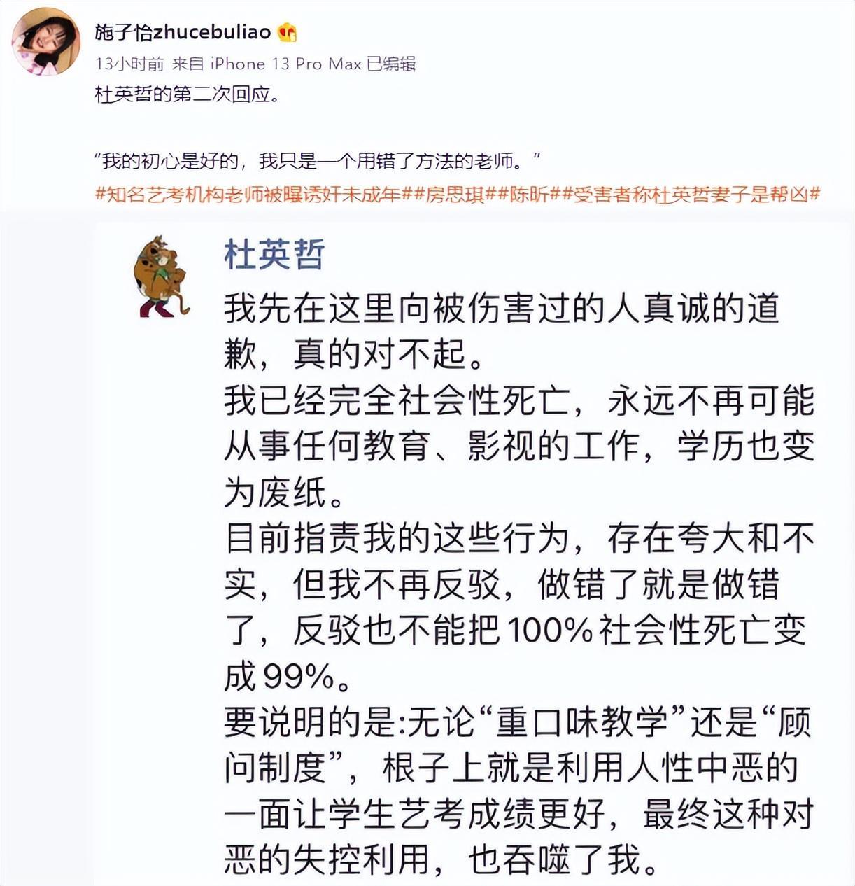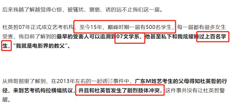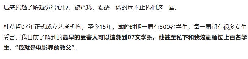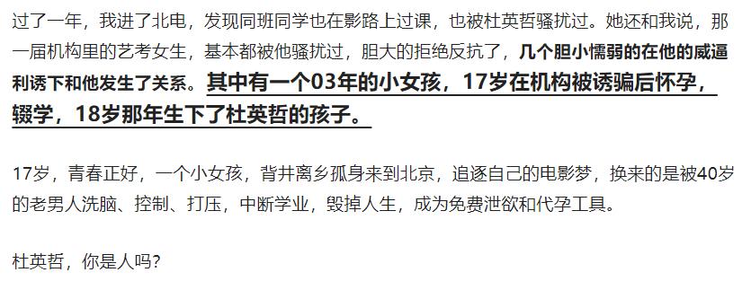 施子怡先表示自己也被赵韦弦骚扰,而杜英哲正是赵韦弦的艺考老师,杜英哲本人一样毕业于北电,在创立了艺考机构后,依托职业便利,诱骗了多位女生,还致使一位年仅17岁的少女怀孕辍学。