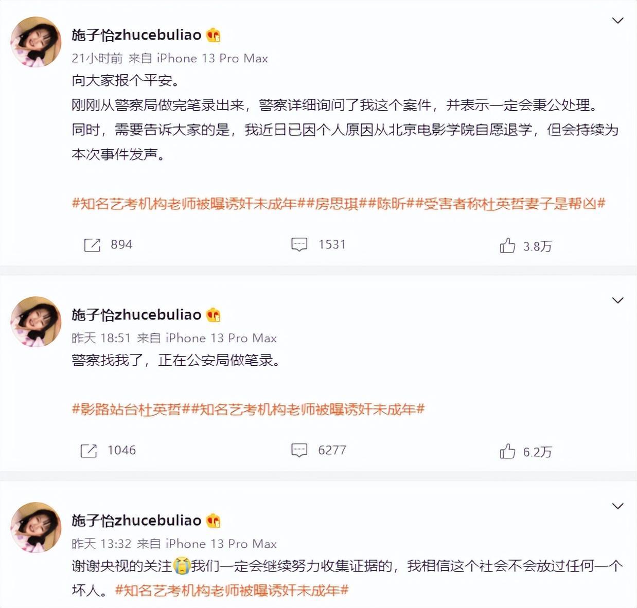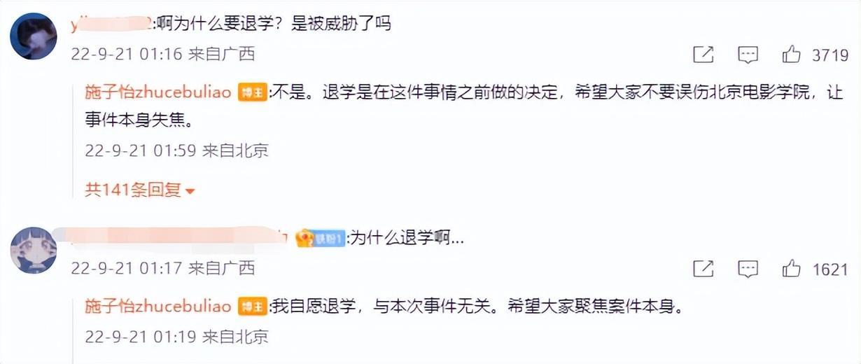 9月20日,施子怡做完笔录跟网友报了平安,并表示自己已经选择从北电退学,并会持续发声。