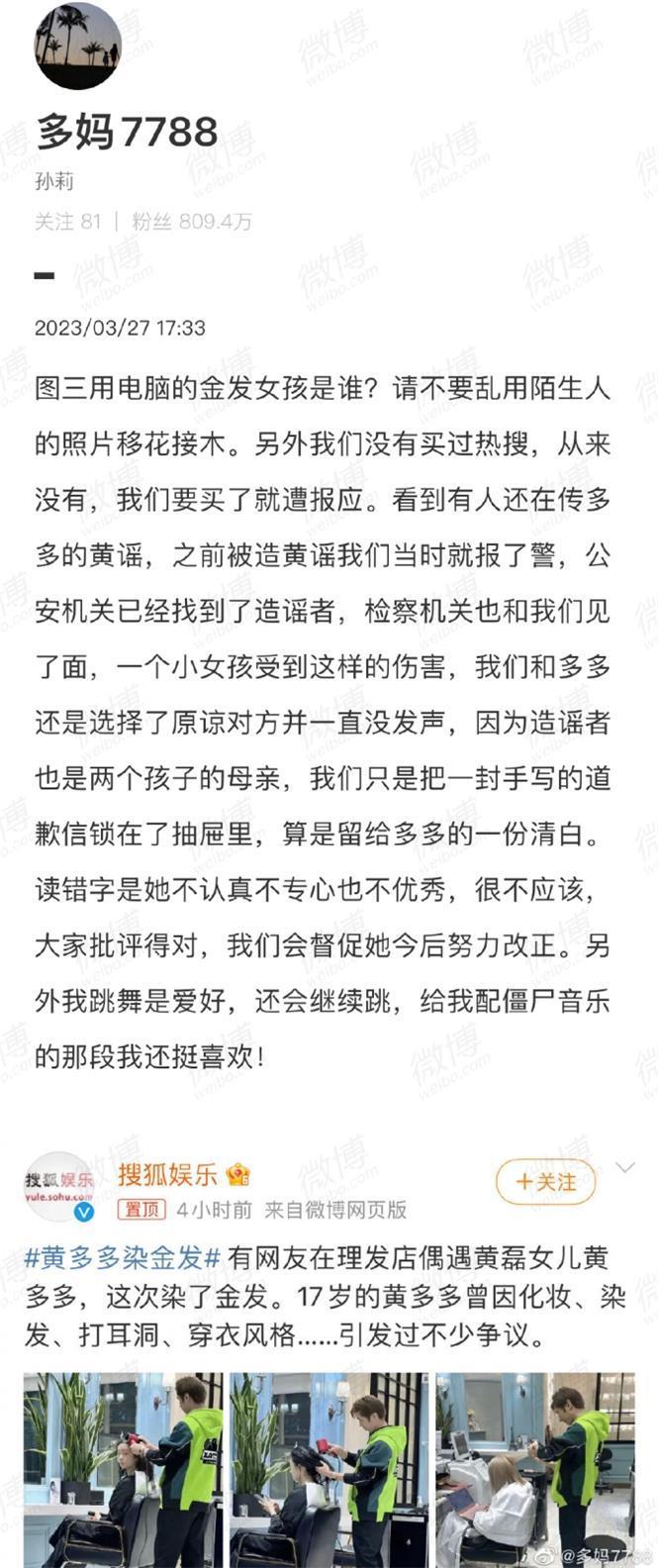 3月27日,黄多多染金发突然冲上热搜,起因是有人晒出在理发店偶遇多多洗头染发,本来是17岁爱美的年纪染发无可厚非,没想到却引来争议,还被质疑芝麻点大的事常常上热搜,这是故意的吗?