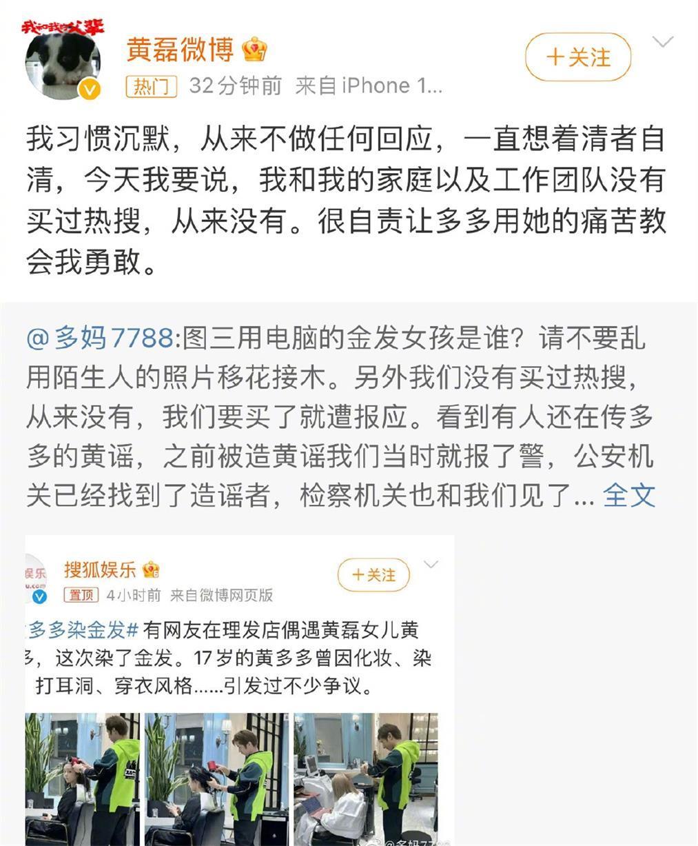 首先他表示,作为一个父亲角色,认为清者自清。其次,否认为多多买热搜。最后明白多多的痛苦,教会了他应该勇于反抗。相对于孙莉的回应,黄磊简单的多。