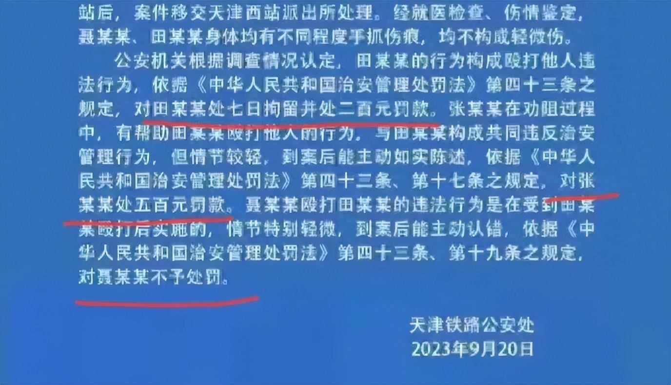 2 一家三口的说辞则是聂女士先动手,但监控显示聂女士一开始只是进行口头争吵,而田大妈先动手,打人在先。根据警方的调查,田大妈被拘留七日并处罚200元,张大爷则因协助田大妈被处罚500元,而聂女士由于在遭受殴打后进行还击,被认为情节较轻,不予处罚。