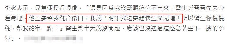李宓还坦言,医生在帮我缝合伤口期间,我已急切想生二胎。于是对医生说,明年我要赶快生女儿,医生你要慢慢缝合,缝牢固一点,结果把医生逗笑了,直言没遇过这么着急生二胎的孕妇。