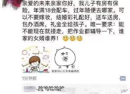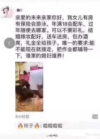 笑哭!最近微博上出现了一组女孩致信未来亲家的热点,有的说道“有房送车配嫁妆,能不能现在就接走!“不要彩礼,嫁妆配好,送房送车,包办酒席,礼金全给孩子,唯一的要求:能不能现在就接走,把作业都辅导一下,谁家的媳妇谁养!”日前,有家长给未来亲家写信,真的有家长回复哦~
