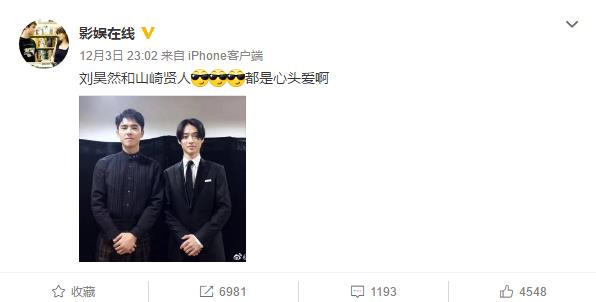 12月3日,某娱乐账号晒出了一张刘昊然和山崎贤人的合影,引得网友感慨:“次元壁已被敲碎!”