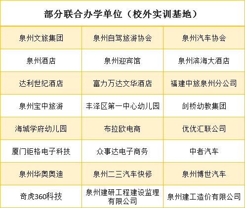 泉州工商旅游学校是丰泽区唯一一所公办省级重点职校,是福建省规范化职业学校,2016年正式挂牌作为黎明大学分校,实现与高校资源共享、优势互补。学校地处泉州市区城东街道霞美社区,毗邻华侨大学、泉州五中等著名学府,文化氛围浓厚。学校开设有旅游管理、航空服务、学前教育、烹饪、电子商务、汽车美容与装潢、网络信息安全、建筑工程造价等专业,现有在校生1902人,50个教学班。学校办学条件优越,设备设施先进,学生公寓配有独立阳台、卫生间、太阳能热水、空调、洗衣机等,校园实现无线wifi网全覆盖,供学生免费使用。学校坚持走与高校合作、校企合作的办学之路,与60多家知名企业联合办学,学生就业率达98%;分别与黎明大学、泉州幼儿师范高等专科学校、北京翔宇航空学院等高校联办,每年有300多名毕业生通过五年专、高职单考考上大学,圆大学梦。