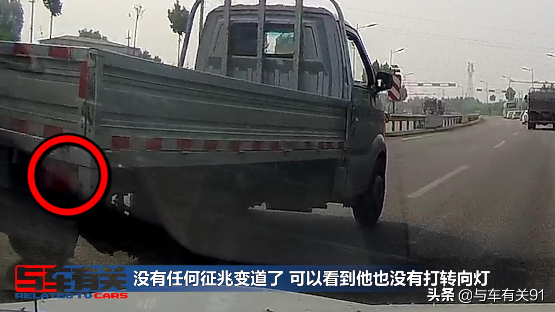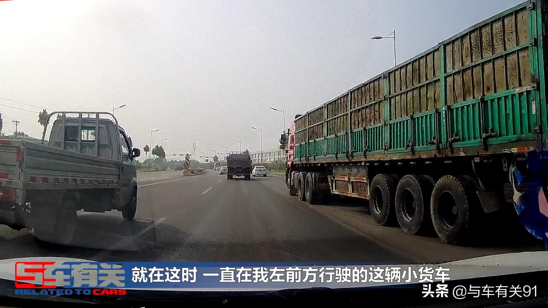 是压着我们右边的车道线过来的,看到这样的情景我并没有着急去加速,就在这时,一直在我左前方的小货车没有任何征兆的变道了