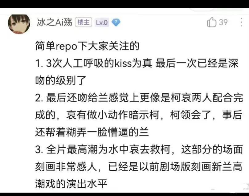 而且这名观众透露:最后一次的时候,柯南恢复了点意识,隐隐约约有和灰原哀配合深吻的意思…
