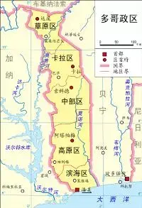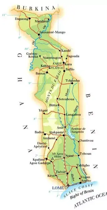 多哥共和国,介于北纬6-11°、东经0-2°之间,是西非国家之一,东面与贝宁,北面与布基纳法索,西面与加纳相邻,南面有一小段海岸线面向几内亚湾。面积56,785平方公里。海岸线短(55公里)而平直,长53公里。全境狭长,