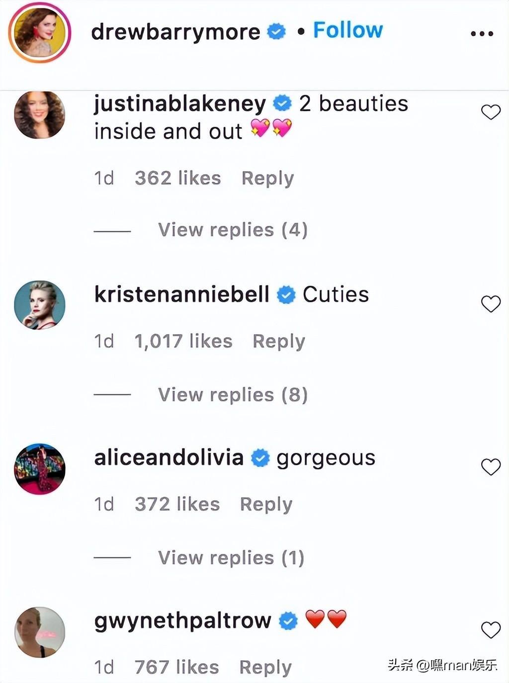 一位粉丝写道,“我欣赏她们自然老去的美丽,感谢她们没有过度美化这张照片。”她们其他的朋友也在评论中称赞两人,克里斯汀·贝尔写道,“小甜心们。” 演员格温妮丝·帕特洛和模特米兰达·可儿也给卡梅隆·迪亚兹和德鲁·巴里摩尔点亮了小爱心。
