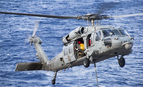 舰载直升机海鹰直升机长19.75米,旋翼直径16.35米,高5.2米,最大起飞重量9,927千克,最高飞行速度为267公里/小时,航程834公里,飞行高度超过3000米,装备有先进的吊放声呐、雷达和电子对抗系统,可配备机枪、鱼雷和导弹等武器