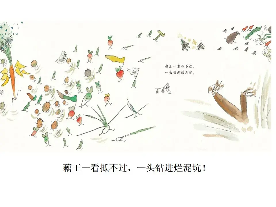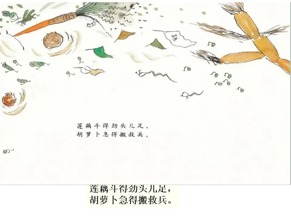 莲藕斗得劲头儿足,胡萝卜急得搬救兵。