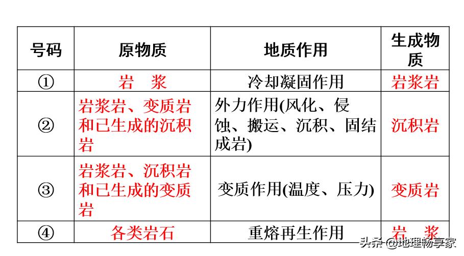 其实,判读关键是在整个物质循环过程中,抓住四种物质:岩浆、岩浆岩、沉积岩和变质岩;四种作用力:上升冷却凝固、外力作用(包括风化、侵蚀、搬运、沉积和固结成岩)、变质作用和重熔再生。