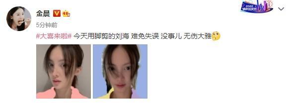 Yes娱乐4月19日讯 4月19日,金晨发微博晒出自拍照自己剪的刘海,并调侃刘海时自己用脚剪的,并表示“ 难免失误 没事儿 无伤大雅”。