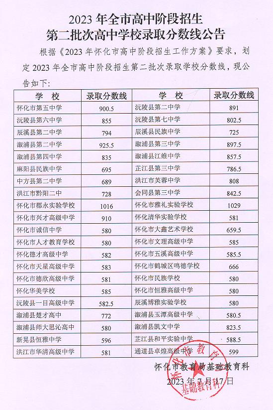 7月17日,怀化市教育发布《2023年全市高中阶段招生第二批次高中学校录取分数线的公告》,《公告》划定了怀化市第五中学、沅陵县第六中学、溆浦县第二中学等42所高中学校录取分数线,其中,最高录取分数线为怀化市雅礼实验学校1029分!