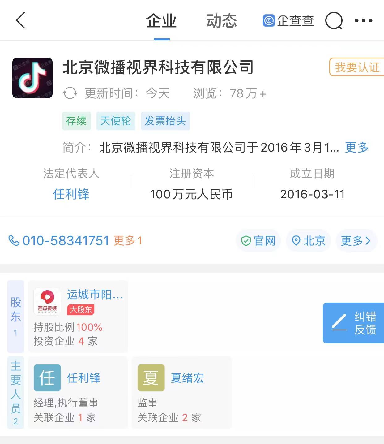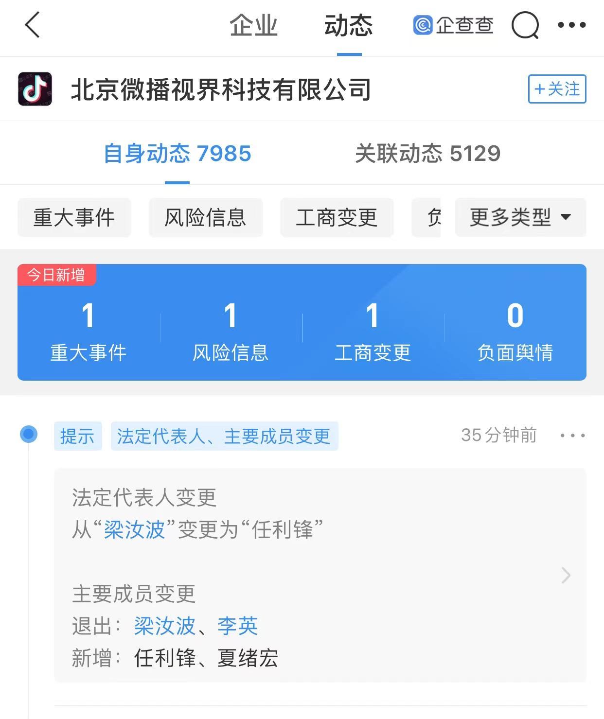 企查查APP显示,抖音短视频创始人梁汝波不再担任北京微播视界有限公司的法定代表人,并卸任执行董事、经理职务,由任利锋接任。去年,梁汝波接替张一鸣担任字节CEO及董事职务。