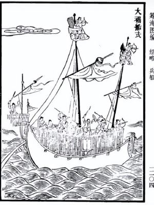 ▲《筹海图编》中的大号福船图,可见模型船上士兵还在大量使用刀枪弓箭等冷兵器作战