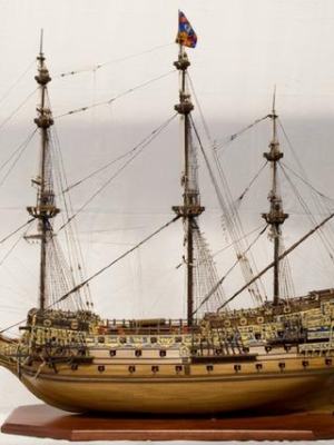 ▲悬挂英国旗帜的早期型盖伦战舰设计模型设计