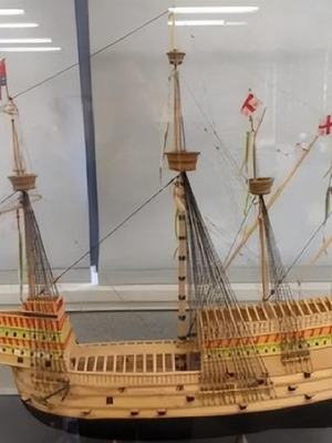 ▲玛丽多大罗斯号模型,可见郑和其侧舷的动力活动炮门