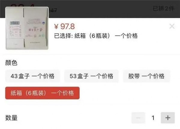 在某电商平台上,飞天茅台酒纸箱97.8元一个。单瓶茅台酒的纸盒以及茅台胶带也有售卖,纸盒32.4一个,胶带94.8元一卷。